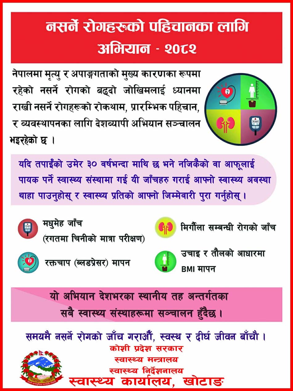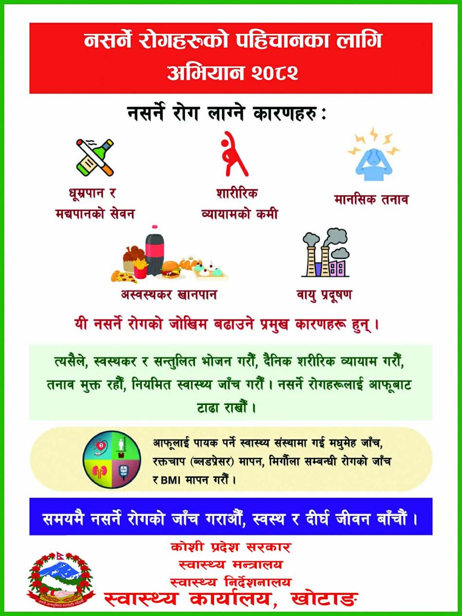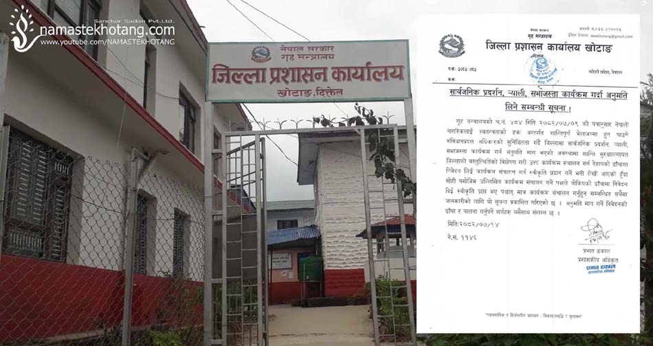 नमस्ते खोटाङ संवाददाता–खोटाङ, कात्तिक १४–सार्वजनिक प्रदर्शन, रयाली, सभाजस्ता कार्यक्रम गर्न अनुमति लिनुपर्ने जिल्ला प्रशासन कार्यालय खोटाङले सूचना जारी गरेको छ । प्रशासकीय अधिकृत प्रभात ढकालले कात्ति� ... ... ...